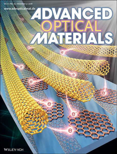 近日,国际著名学术期刊《Advanced Optical Materials》以封面文章形式“All-Carbon Photodetectors: Highly Sensitive Broadband Single‐Walled Carbon Nanotube Photodetectors Enhanced by Separated Graphene Nanosheets (Advanced Optical Materials 23/2018)”发表了麻豆社 电子信息与电气工程麻豆社薄膜与微细技术教育部重点实验室苏言杰课题组在全碳Van de Waals异质结高性能宽光谱光电探测方面取得的取得了突破性进展。硕士研究生蔡葆昉为论文第一作者,苏言杰副研究员为论文通讯作者。