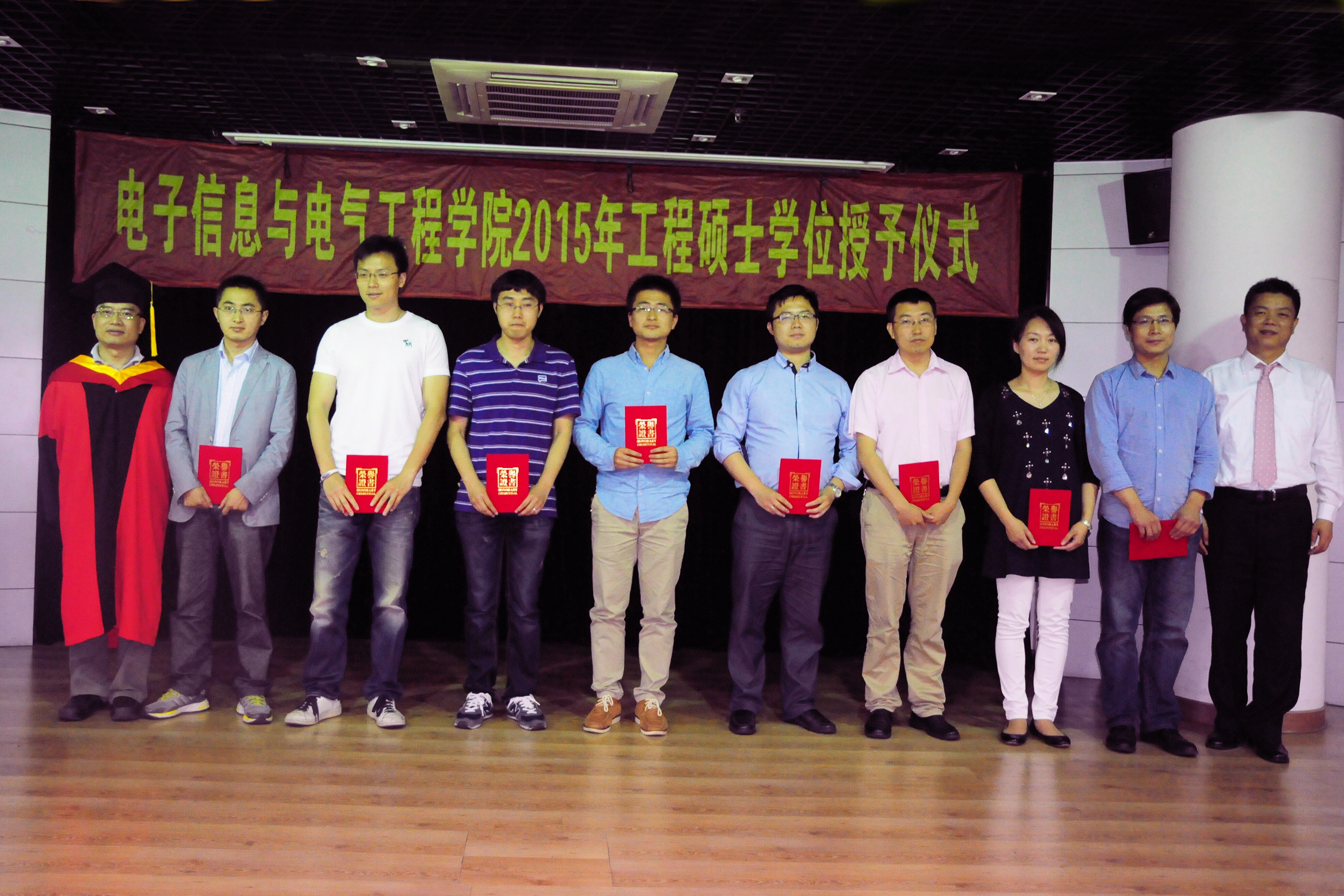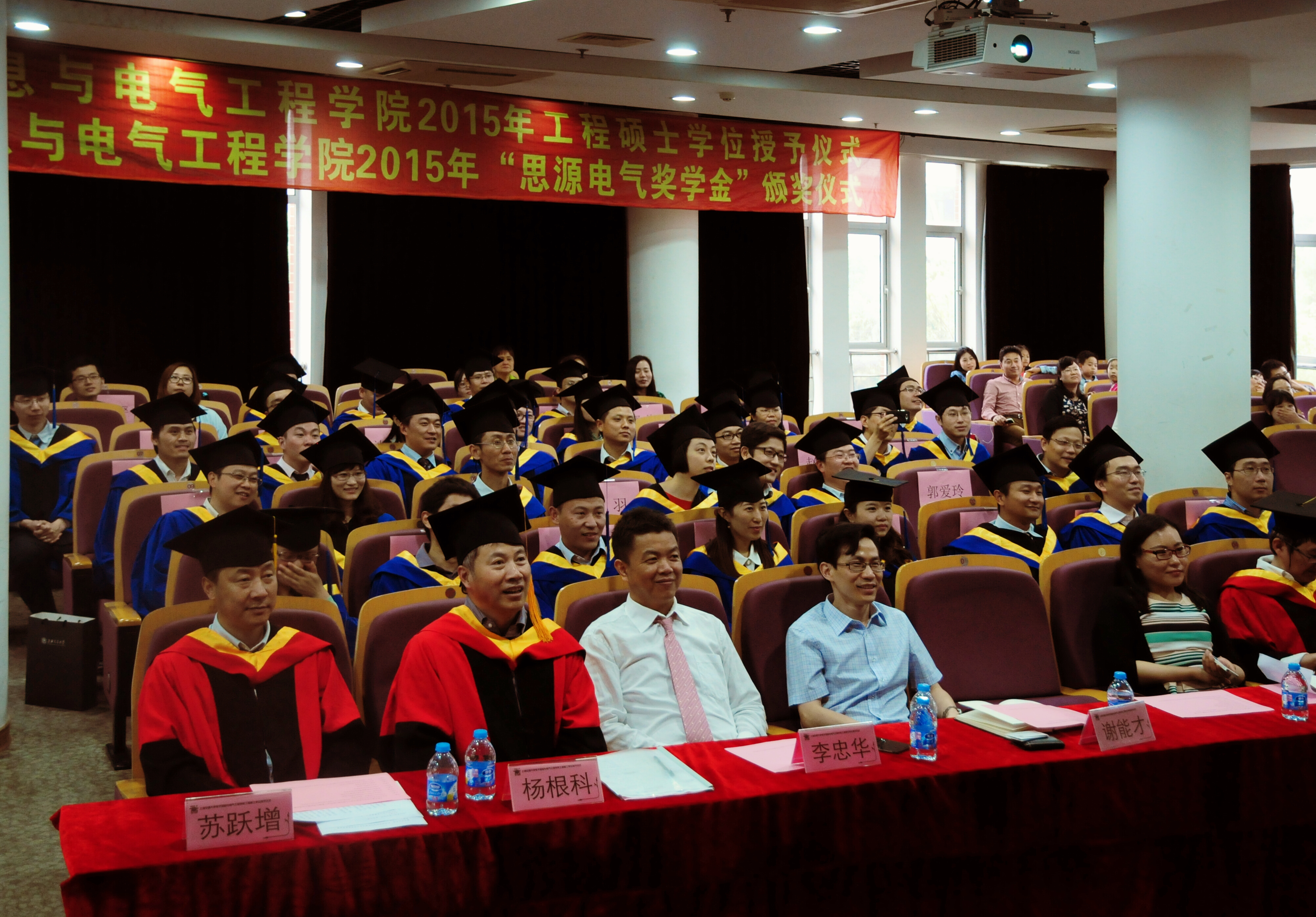 2015年5月23日,麻豆社 电子信息与电气工程麻豆社2015年工程硕士学位授予仪式在电院楼群报告厅隆重举行。学位授予仪式由电院副院长邰能灵主持。研究生院副院长杨根科、电院党委书记苏跃增、党委副书杨一帆、电气系主任严正、先进电子材料与器件校级平台(AEMD)主任苏翼凯,导师代表张忠能,宝钢首席研究员兼特聘导师郭朝晖,思源电气股份有限公司总经理助理李忠华,昆山龙腾光电有限公司人力资源部经理谢能才等出席了典礼。