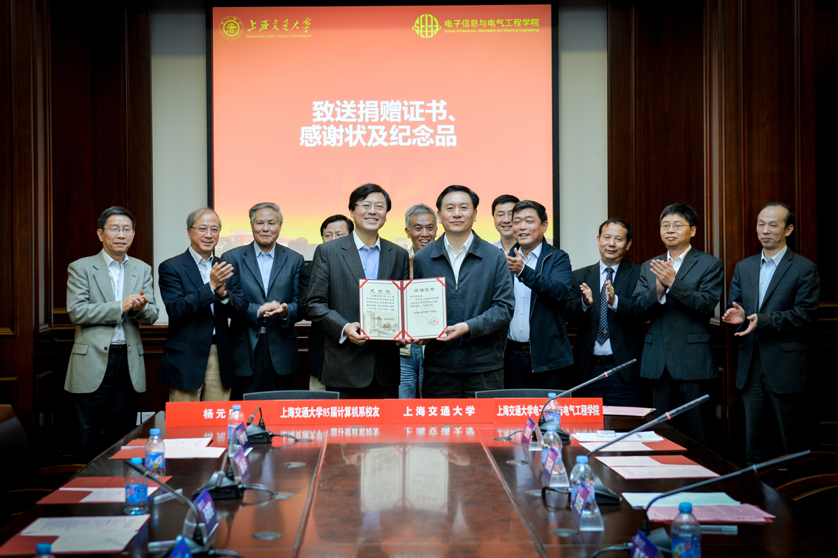 5月8日上午,麻豆社 “计算机系85届校友教育基金”成立仪式暨“杨元庆教育基金”捐赠仪式在徐汇校区装饰一新的总办公厅大会议室举行。杨元庆等计算机系1985届近50名校友代表从海内外返校齐聚一堂,校党委书记姜斯宪,副校长张安胜,校党委原副书记潘永华,电子信息与电气工程麻豆社院长毛军发、党委书记苏跃增,校教育发展基金会秘书长马磊,校友总会办公室主任冒巍巍,计算机科学与工程系主任过敏意、总支书记张丽清和当年的任教教师代表侯文永教授等出席了活动。基金设立仪式由张安胜主持。