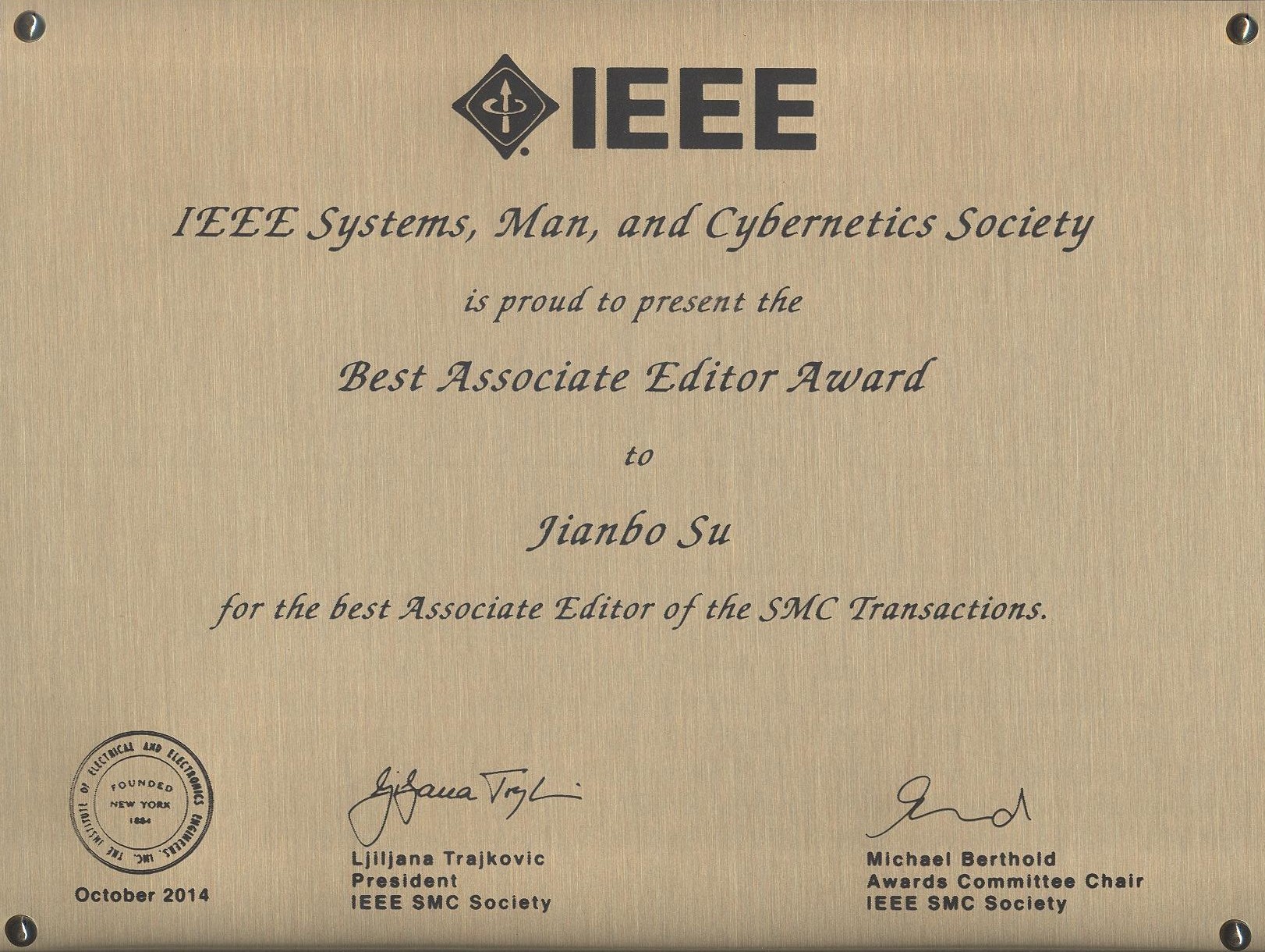 IEEE SMC分会的Best Associate Editor Award是从为 IEEE Transactions on Cybernetics期刊担任 Associate Editor 的103位来自全世界32个国家和地区的学者中遴选出来的。通过考察AE推荐发表的稿件的引用率和学术影响力、处理稿件的及时性、主持的专刊(Special Issue)引领学术方向和形成学术热点的敏感度等几个方面,由历任主编推荐,现任主编提名,并最终通过分会的 AdCom Committee投票产生。