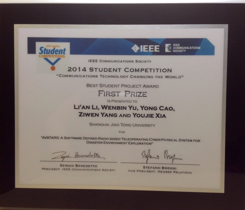 从2014年12月在美国奥斯丁举行的IEEE全球通信会议(Globecom’14)传来喜讯,交大电院自动化系关新平教授领导的“智能无线网络与协同控制研究中心”学生竞赛团队—i-WIN团队力压MIT等名校队伍,凭借其名为“阿凡达”的“软件无线电远程控制信息物理系统”(AVATARS: A Software-Defined Radio based Teleoperating Cyber-Physical System for Disaster Environment Exploration)荣获“2014 IEEE通信学会学生竞赛”全球冠军!自动化系博士生李立安作为IEEE通信学会全额资助的唯一获奖代表,前往美国参加Globecom’14并获颁奖状和奖金。