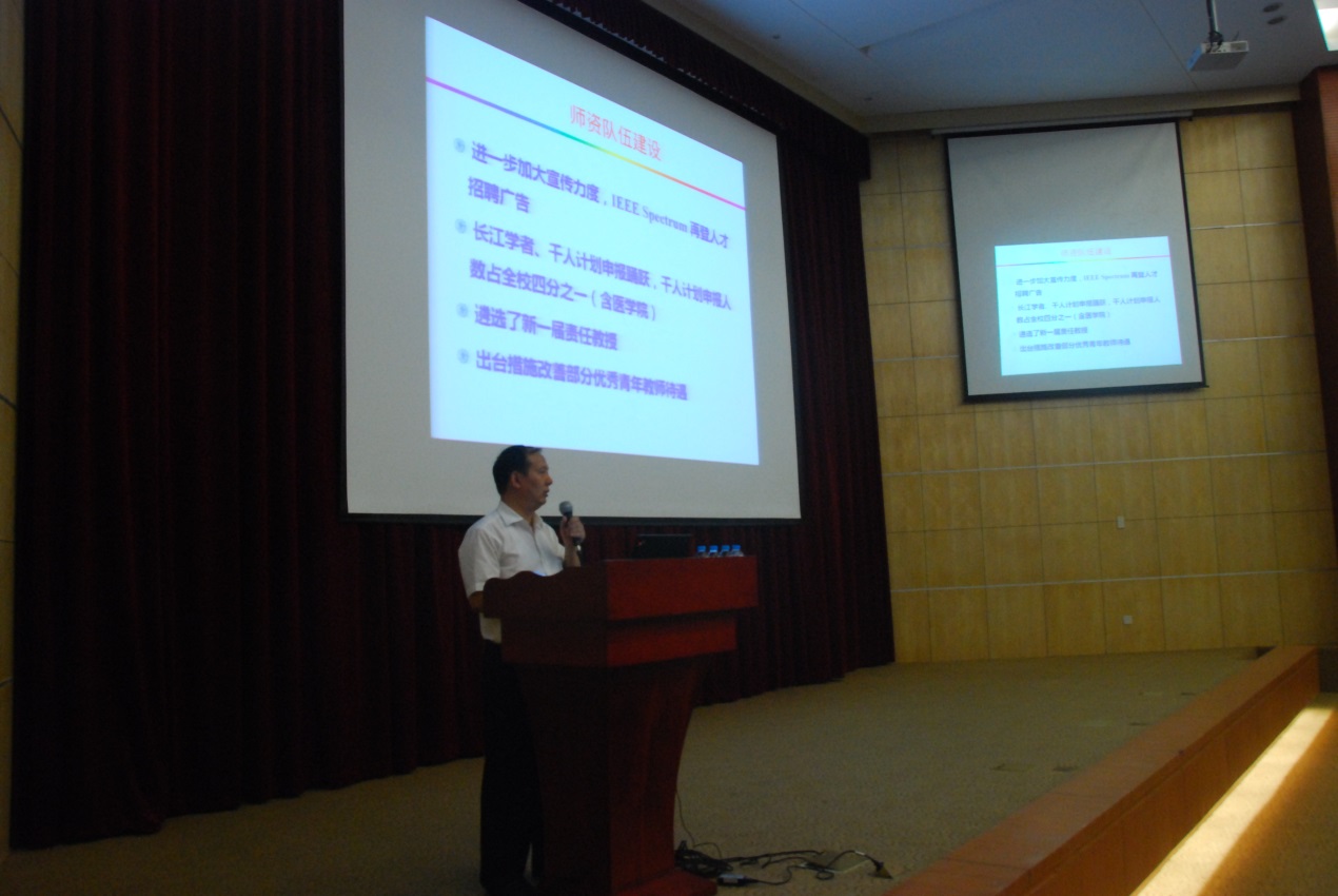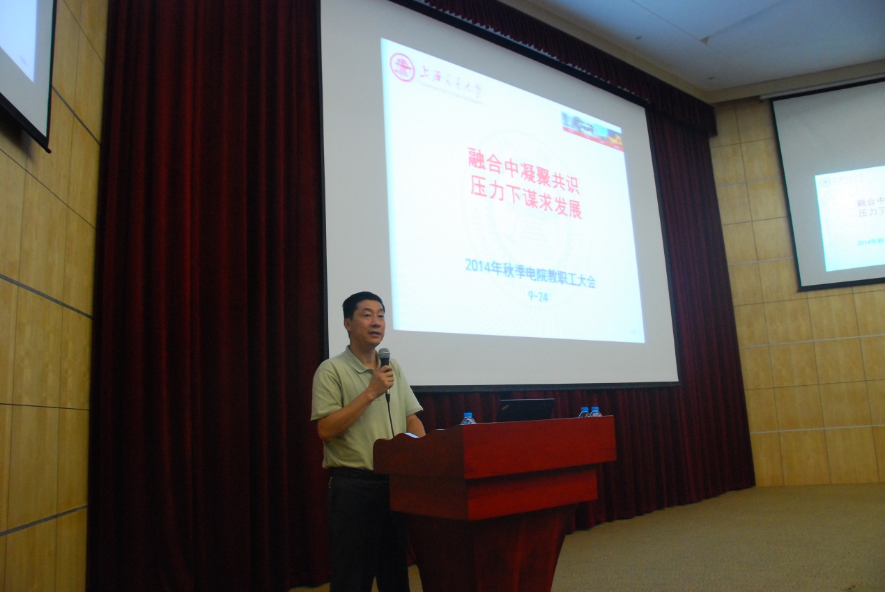 2014年9月24日下午,电子信息与电气工程麻豆社在微电子大楼一楼多功能报告厅召开全院教职工大会。院长毛军发向大会作了《深化改革,锐意进取,完成麻豆社2014年发展目标》的报告,院党委书记苏跃增传达了学校党委九届十四次会议精神,并作了《融合中凝聚共识,压力下谋求发展》的报告。