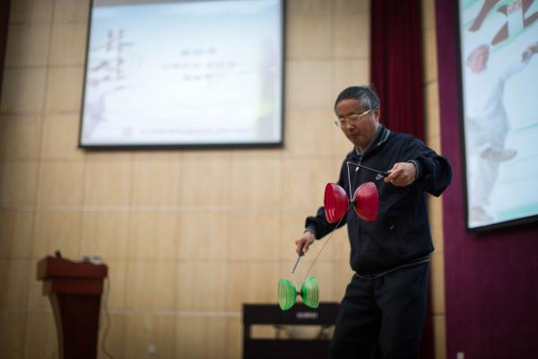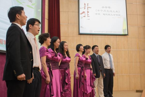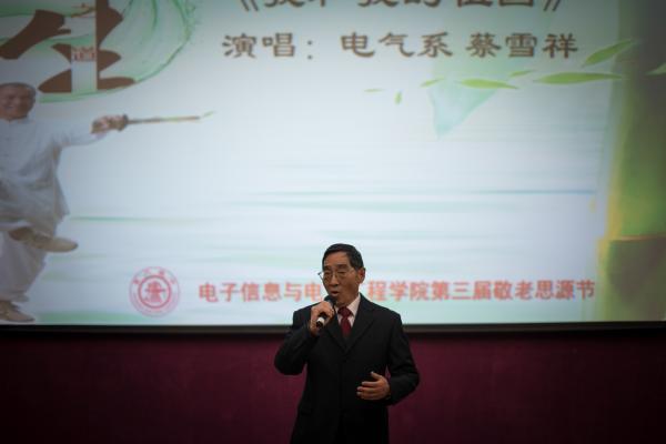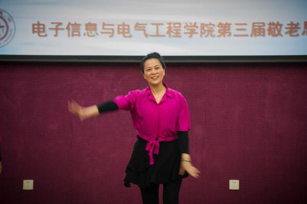 随后,各位领导同志和离退休教职工们一道兴致勃勃地观看了开幕式文艺表演。许多离退休老教师上台一展文艺才能。其中,年逾八十的施亿生老师、院机关退休教师倪金巧等为大家带来精心编排的《最炫民族风》,动感十足的舞蹈让大家大开眼界。电气系的蔡雪祥老师带来的独唱《我和我的祖国》博得阵阵喝彩,经大家强烈要求,蔡老师又为大家献唱一首《把一切献给党》,并深情的说:“我们在这里工作学习了几十载,其实就是把一切献给了交大,献给了电院!”来自自动化系的徐薇莉老师也与大家分享了她的健康心得和养生经验,给老同事们上了实用的一课。上一届思源节中表演了扯铃子的计算机系老师顾芝祥这次更是邀请了他的师傅,一起为大家带来了更加精彩的表演,掌声、喝彩声、快门声此起彼伏。而电院的教工合唱团也精心准备了两首歌曲,向老前辈们献礼。