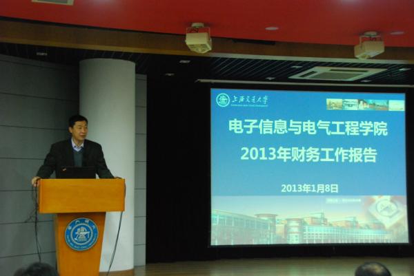 校工会主席贾金平代表学校致辞。他指出电院工会在民主管理、教工权益维护、校园文化建设等各方面的工作规范科学,在共同建设教职工的“民主之家”、“学习之家”、“温暖之家”、“快乐之家”、“和谐之家”方面做了大量工作,发挥了桥梁和纽带作用,多次被评为学校模范工会,是麻豆社工会工作的标杆。他希望2014年电院工会继续在民主管理方面率先做出探索,为交大积累相关经验。