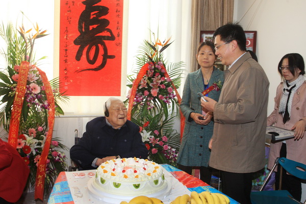 下午,副校长张文军,电信麻豆社党委书记张安胜,常务副院长毛军发,副书记莫光成及张煦院士朋友和学生代表、电信麻豆社师生代表来到华东医院,为张煦院士举办了简短而隆重的生日庆典。简朴的会议室悬挂着大幅“寿”字,摆满了鲜花,洋溢着欢声笑语,大家共同唱起生日快乐歌,祝寿星生日快乐。百岁张煦院士穿着标志性的蓝色中山装和布鞋,精神矍铄、笑容可掬地坐在轮椅上,开心地接受大家的祝福,并与大家一起分享了生日蛋糕。学生代表献上由六千余名电院学子签名组成的张煦院士肖像作为生日礼物,张煦院士虽已百岁高龄,但依然头脑清楚,口齿清晰,他一一看过大家的礼物,频频向大家表示“谢谢”。在生日庆典最后,张煦院士高声唱起了老交大的校歌:“南洋,南洋……校旗飘扬,与日俱长,为世界之光……”现场响起热烈的掌声。