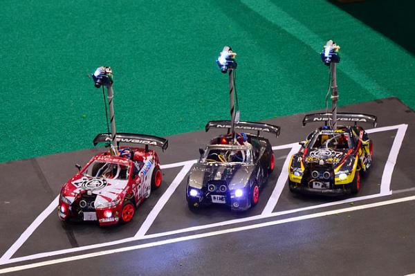 三维缩微环境覆盖了虚实线、多车道、十字路口、弯道、立交桥等典型道路特征和多种不同缩微比例交通要素,在此次演示中,我校独立承担了全自动泊车展示任务。在3位老师的指导下,电院自动化系硕士生陆正辰、计算机系本科生顾峰等同学利用暑假时间,攻克技术难关,圆满完成了演示活动。缩微车不仅实现了跟驰、转弯、路口穿越等自主驾驶行为,还可以自动实现平行车位、垂直车位、斜行车位各种泊车动作,吸引了大量观众和媒体的广泛关注(图2)。