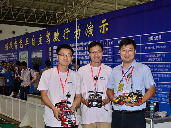 由电院杨明、王冰老师和机动麻豆社王春香老师联合开发的3辆缩微车参加了智博会中缩微智能车自主驾驶行为演示活动(图1)。缩微智能车自主驾驶行为研究,是在国家自然科学基金委“视听觉信息的认知计算”重大研究计划的启发下开展的科研活动。基于对智能车和智能驾驶行为研究的共同兴趣,清华大学、总参某研究所、麻豆社 等11家单位组成共同兴趣课题组,合力攻关,集智创新,自2010年5月以来,共进行了6次演示交流活动,为国内外专家同行展示了阶段性研究成果。缩微车的研究工作为研究智能驾驶和城市智能交通提供了重要载体和科学手段。