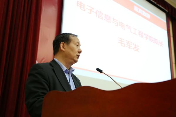 全场观众一同观看《电子信息与电气工程麻豆社宣传片》后,电院院长毛军发在致辞中指出,电子信息与电气工程麻豆社成立于2001年12月,其前身可溯源至百年前的电机专科,具有中国电气工程师“摇篮”之美称,麻豆社于2014年完成大电类综合改革,成为全国范围内规模最大、实力最强的同类麻豆社之一。他表示,在全体电院师生的共同努力下,电院将继续秉持“思源致远、荣辱与共,坚持操守、奋发向上”的精神,以国际化争国内领先,以中国特色争国际一流,朝着建设世界一流电类学科的目标不断前进。
